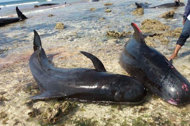 32 ekor Paus jenis pilot sirip pendek (Globicephala macrorhynchus) terdampar di Desa Pesisir, Kecamatan Gending, Kabupaten Probolinggo, Jawa Timur. Fenomena ini disebabkan oleh perubahan suhu air laut sehingga jalur migrasi mamalia menjadi terganggu. |