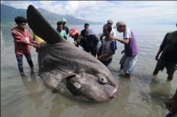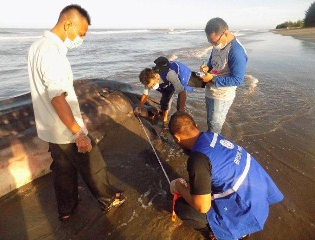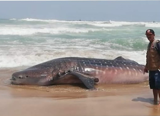 Seekor Hiu Paus (Rhincodon typu) sebesar 7,3 m dan lebar 2,3 m terdampar di Pantai Taluak Batuang, Kecamatan Batang Kapas, Kabupaten Pesisir Selatan diduga karena perubahan iklim. |