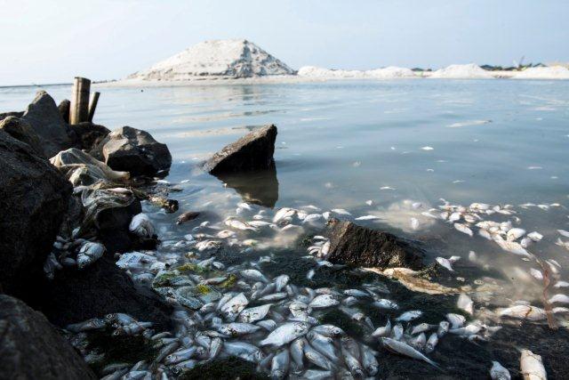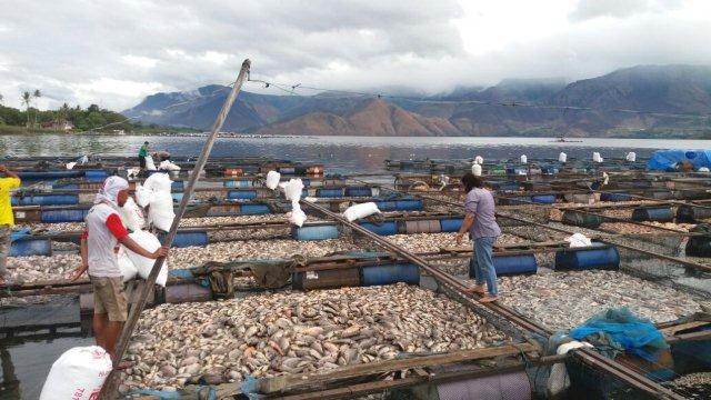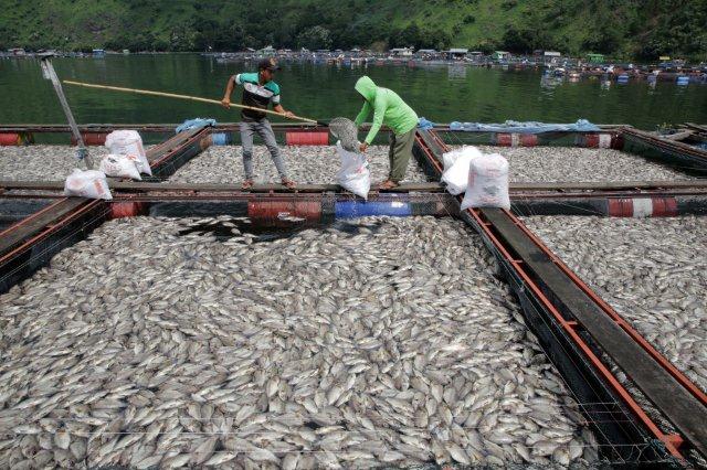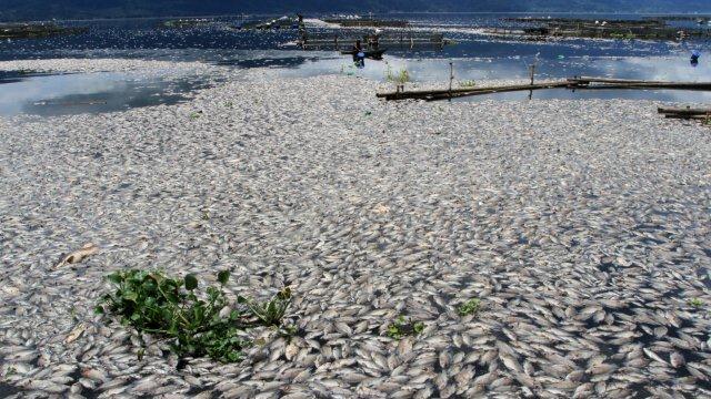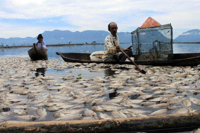 Permukaan air danau yang keruh serta kematian pada ikan akibat fenomena up-welling |