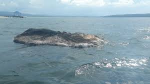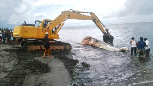 Ikan Paus sperma (Physeter macrocephalus) terdampar dalam kondisi mati membusuk dan sulit diidentifikasi di Pantai Kawasan Mega Mas, Kota Manado, Sulawesi Utara. Pihak Koordinasi Satker Manado BPSPL Makassar dengan DKP Kota Manado membakar ikan tersebut. |