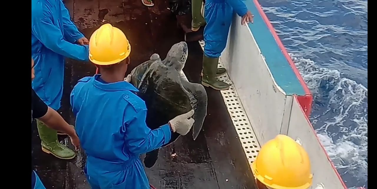 An olive ridley sea turtle or Penyu Lekang (Lepidochelys olivacea) has been captured accidentally during the practical long line fishing by cadets of Politeknik KP Sorong. Caught position near Tanjung Kasbi of Tambraw. It was released immediately. |