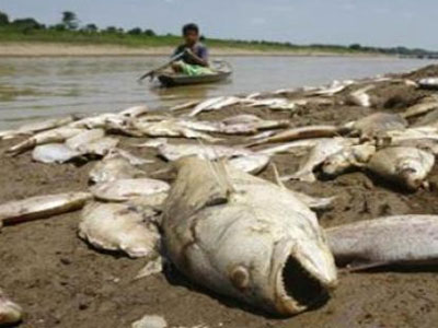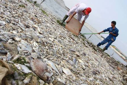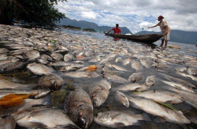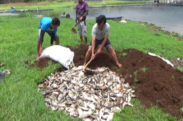 Akibat upwelling yang disertai dengan kenaikan suhu perairan, ratusan ikan di waduk Jangar Cianjur mengalami kematian massal. |