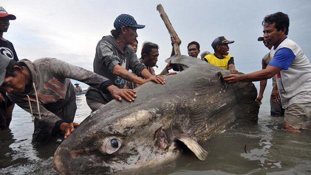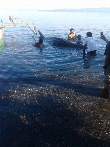 Hiu paus (Rhincodon tipus) dengan berat 1,5 ton terdampar di pantai Bambang, Lumajang dikarenakan perubahan cuaca. |
